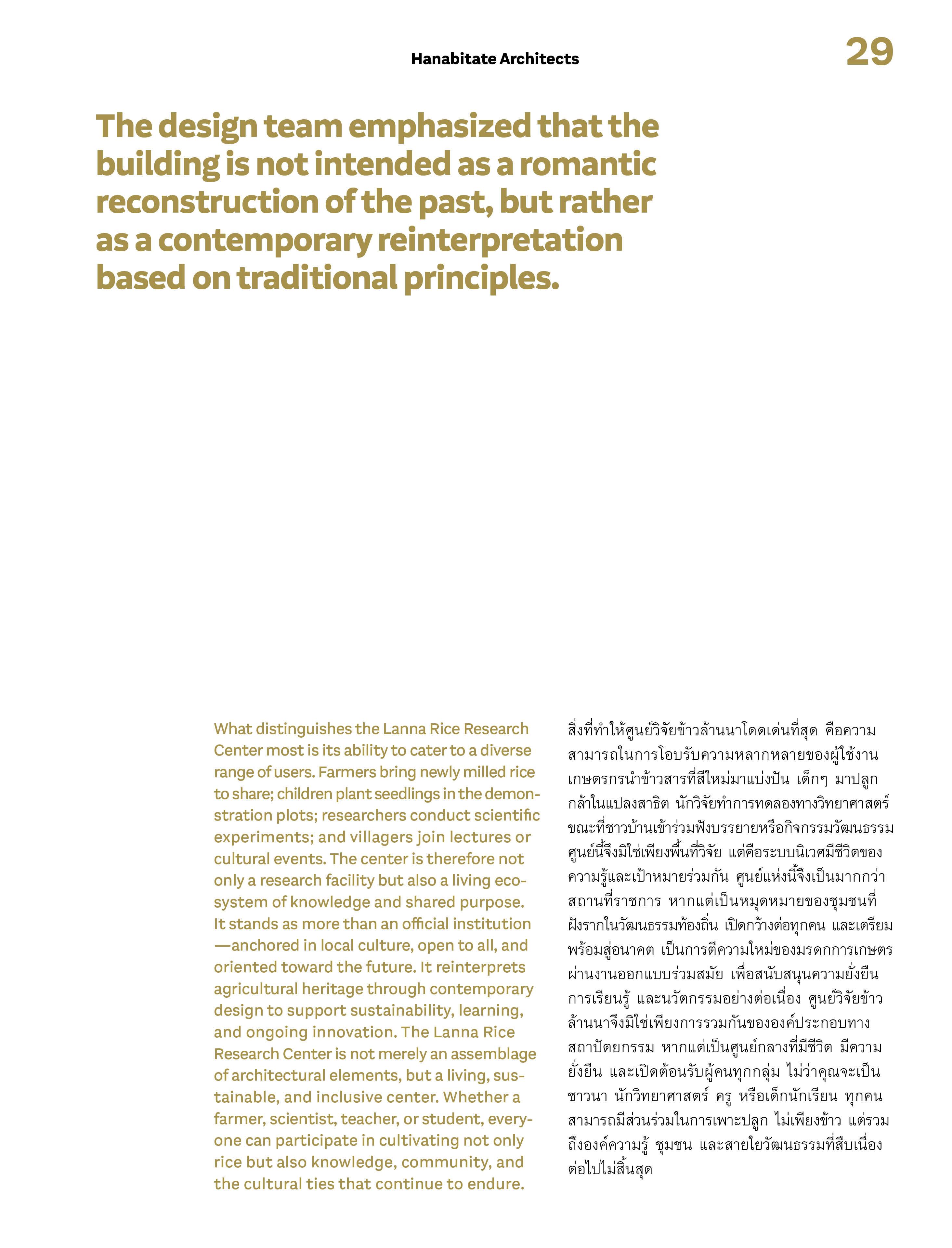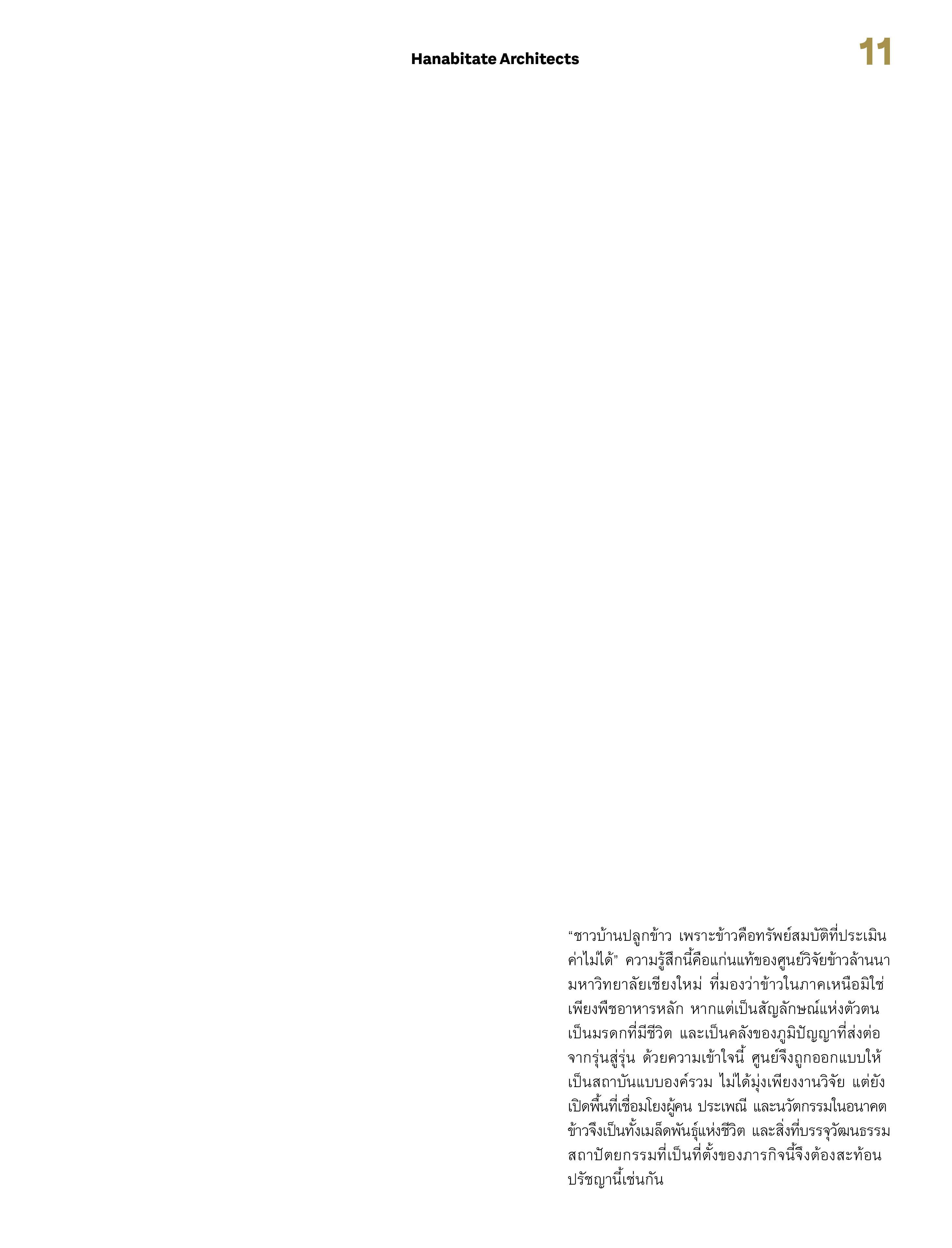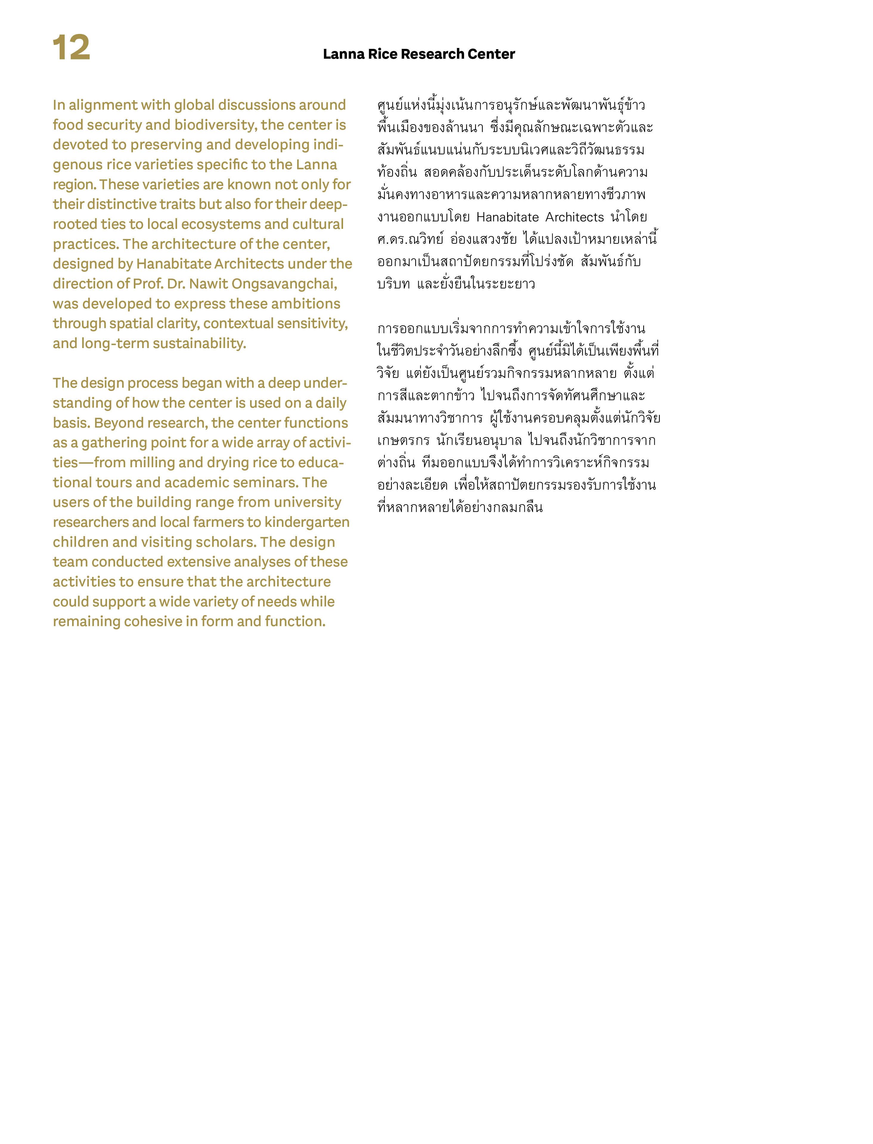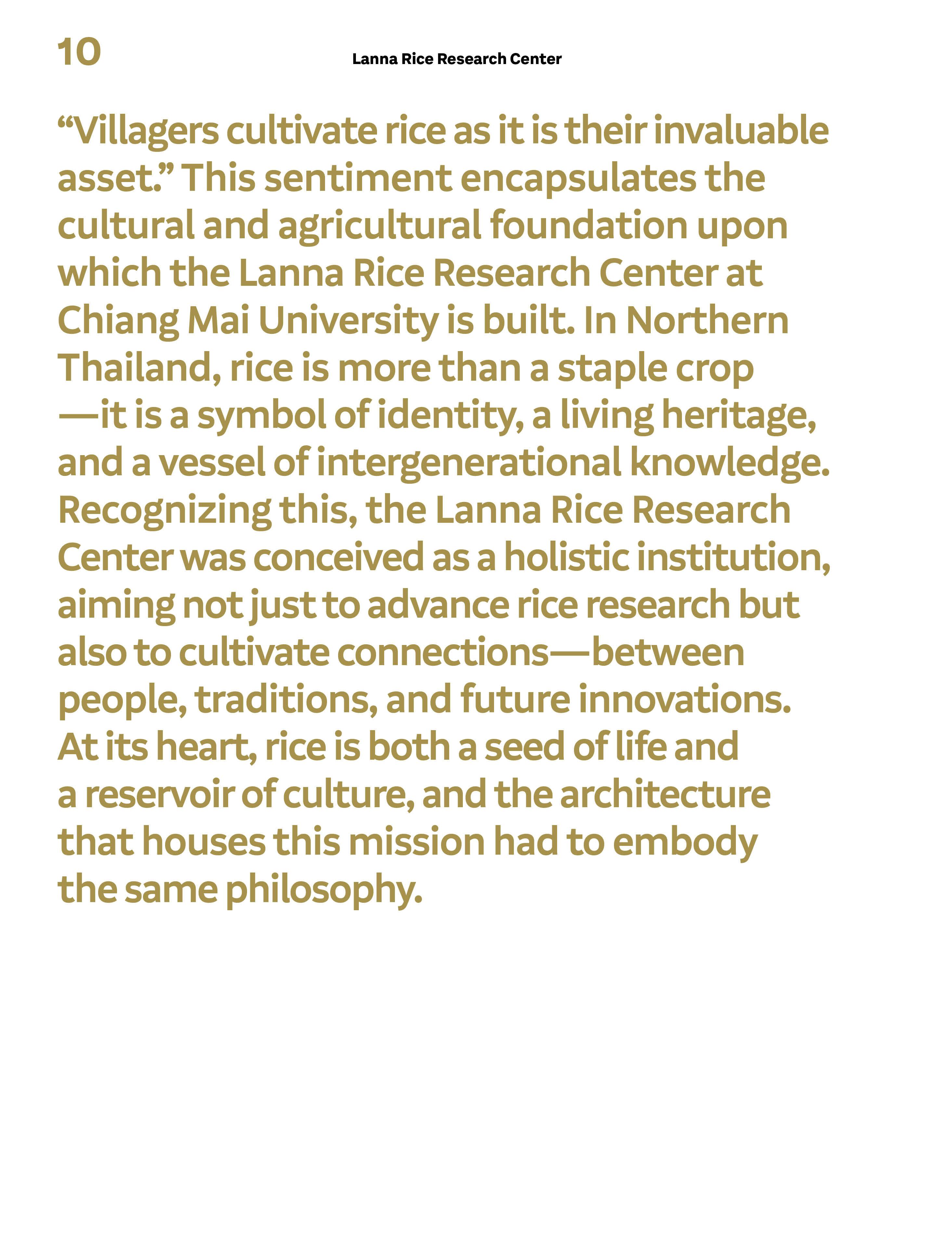 “Villagers cultivate rice as it is their invaluable asset.” This sentiment encapsulates the cultural and agricultural foundation upon which the Lanna Rice Research Center at Chiang Mai University is built. In Northern Thailand, rice is more than a staple crop—it is a symbol of identity, a living heritage, and a vessel of intergenerational knowledge. The architecture of the center, designed by Hanabitate Architects under the direction of Prof. Dr. Nawit Ongsavangchai, was developed to express these ambitions through spatial clarity, contextual sensitivity, and long-term sustainability.