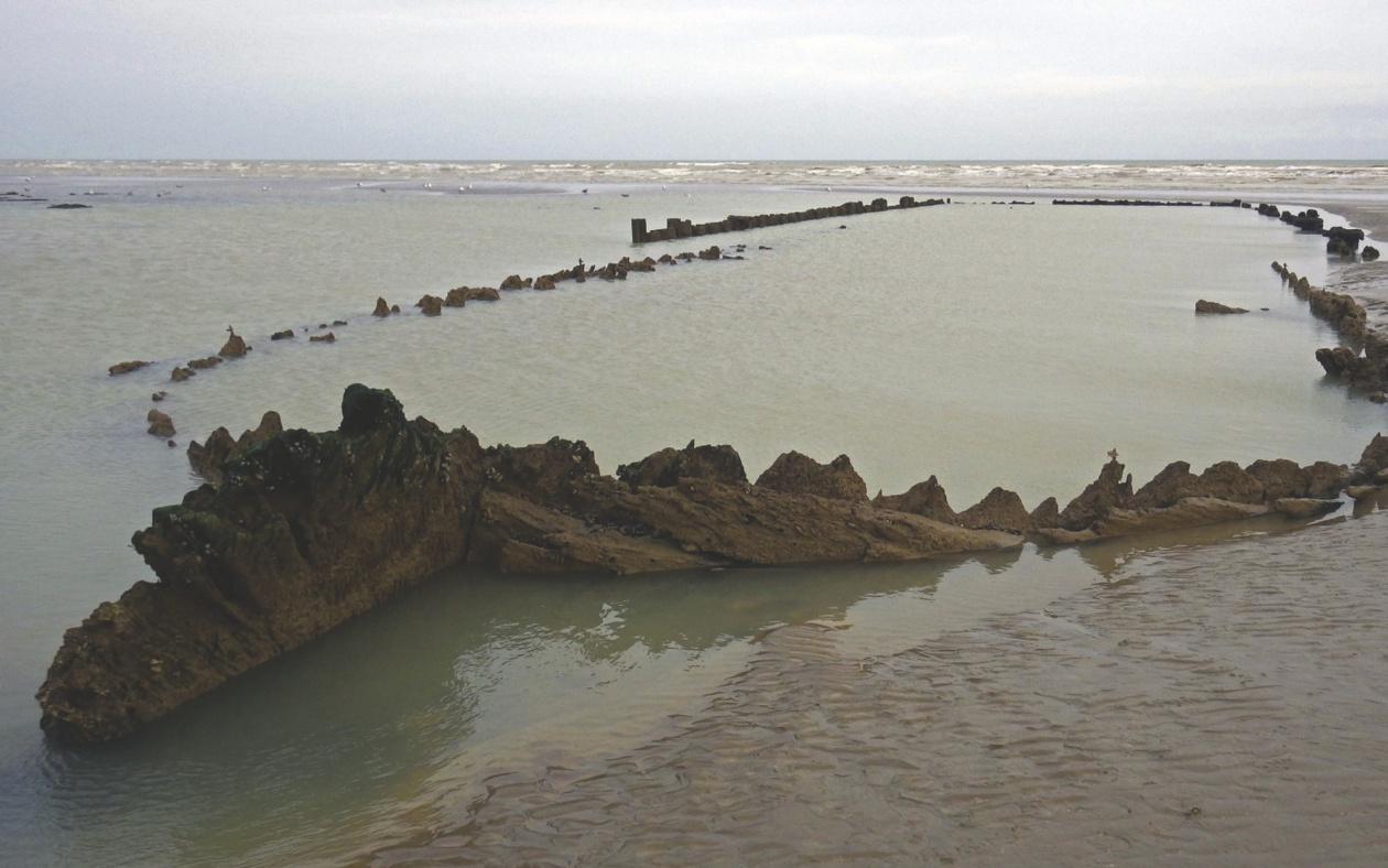BrON 5 Resten van het schip ‘De Amsterdam’ op een strand in Engeland. Foto uit 2019.