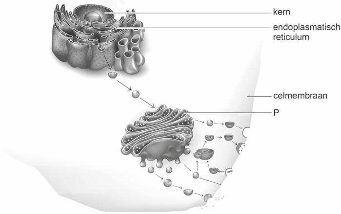 Een eiwit dat betrokken is bij koolhydraat transport bevindt zich bij gezonde personen in het organel dat in de afbeelding met letter P is aangegeven.
