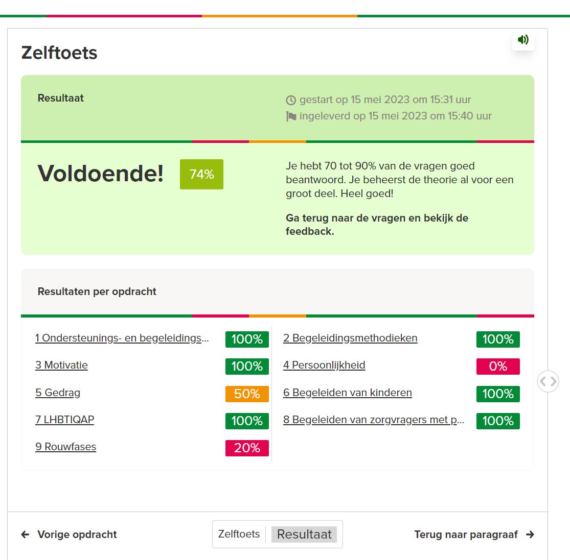 Bij de Zelftoets krijgt de student gerichte feedback over wat hij al beheerst en waar er nog aandacht aan besteed kan worden.