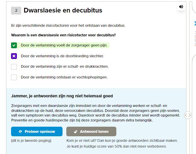 Als de student een eerste antwoord heeft gegeven, en het is nog niet helemaal goed, dan krijgt de student te zien wat er goed is en wat nog niet. Hij kan dan bijvoorbeeld op de theorie klikken om het nogmaals door te nemen of direct nog een poging ondernemen. Op die manier kan hij zijn score verbeteren. Dat doet hij door op ‘Probeer opnieuw’ te klikken.