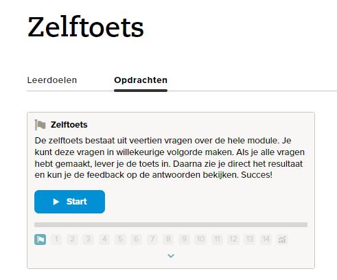 Als de student dit allemaal heeft gedaan kan hij door middel van de formatieve toets (Zelftoets) nagaan of hij/zij de module voldoende beheerst. De zelftoets staat als opdracht klaar bij het overzicht van de modules, zie afbeelding hieronder.
