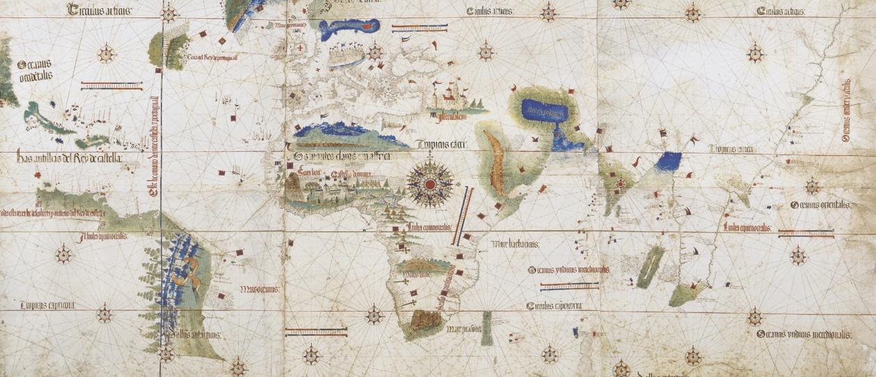 Bron 12 Wereldkaart uit 1502, met daarop de plaatsen waar Portugezen waren geweest. De Portugese zeevaarder Pedro Cabral was in 1500 door een storm op de Atlantische Oceaan op de kust van Brazilië geland. De vele lijnen in de kaart hebben te maken met de navigatie met een kompas.