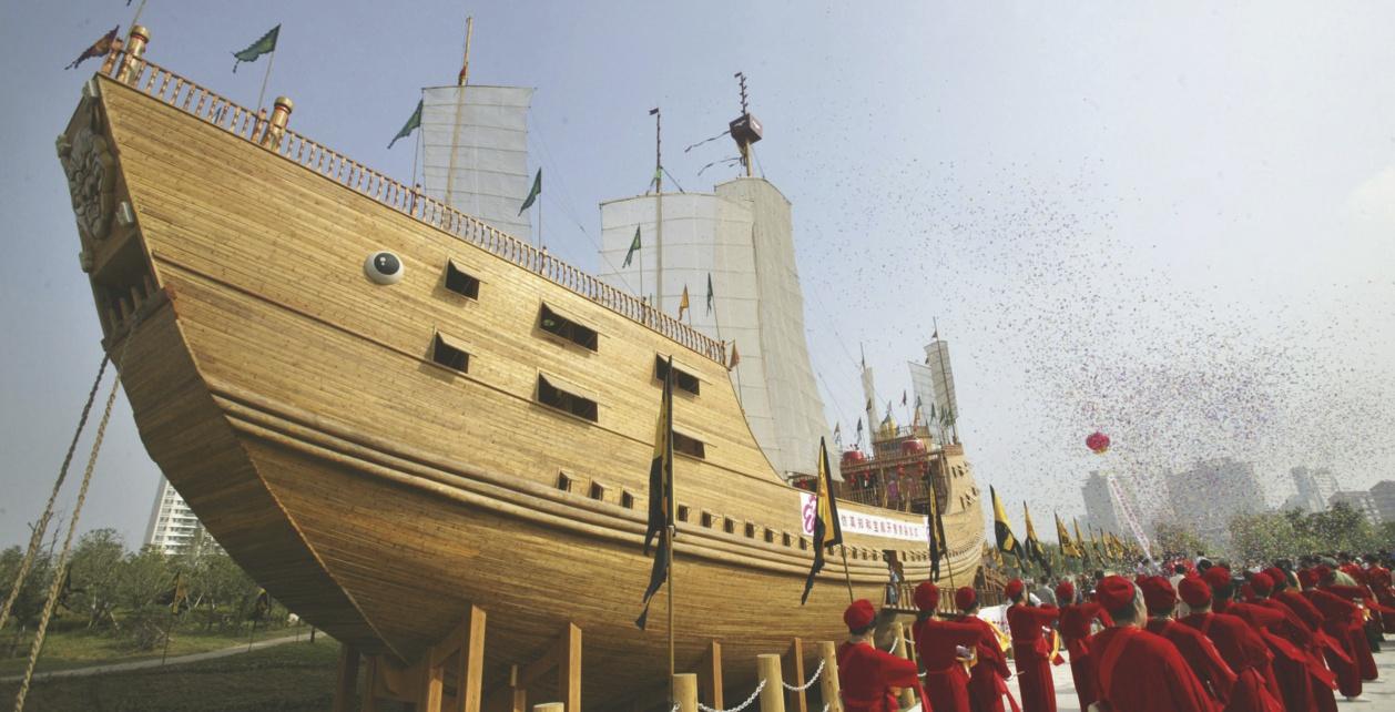 In 2008 waren de Olympische Zomerspelen in China. Ter ere daarvan werd in Nanjing een replica (kopie) gemaakt van het schip van admiraal Zheng He, die hiermee tussen 1405 en 1433 zeven reizen over de Grote en Indische Oceaan maakte. In bron 22 zie je de feestelijke opening van een museumpark naast het schip. Hierna mogen bezoekers een kijkje op het schip gaan nemen. Ze zullen zich verbazen over de enorme afmetingen, want het schip is bijna honderdveertig meter lang en vijfenvijftig meter breed. Volgens Chinese bronnen had het negen masten. Het had waterdichte schotten, zodat vuur of water zich niet snel kon verspreiden. Geen enkel ander schip had dat toen en geen enkel ander schip was zo groot. Wanneer dit schip samen met ruim driehonderd andere Chinese schepen aan de horizon verscheen, maakte dat grote indruk op de volken langs de kust. Dat was precies de bedoeling van de keizer van de toen heersende Ming-dynastie, Yongle. Hij had Zheng He de opdracht gegeven om met zijn vloot de macht van China aan de wereld te tonen. Deze paragraaf gaat over Zheng He en het doel van zijn reizen. Je leest ook waarom die reizen opeens eindigden.