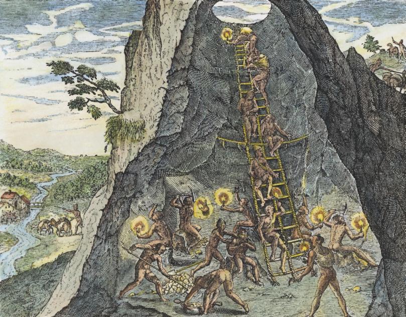Bron 16 De zilvermijn in de Potosi-berg. Tekening (ingekleurd) door Theodor de Bry (1590).
