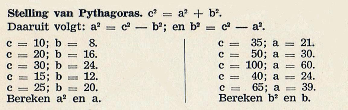 CIn deze oude opgave lijkt het alleen te gaan om het uitrekenen. Toch laat de opgave ook aan de leerlingen van toen zien dat a2 + b2 = c2 niet de enige manier is om de stelling van Pythagoras te noteren. Dat misverstand komt weleens voor, net zoals het idee dat a altijd zou moeten staan voor de kortste zijde van de rechthoekige driehoek.