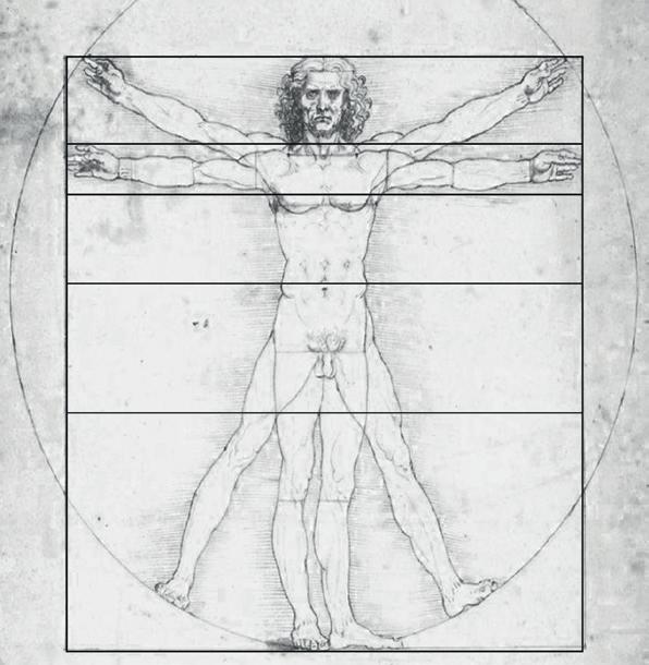 De Vetruvische man van Leonardo da Vinci, met daarop de gulden snede geprojecteerd