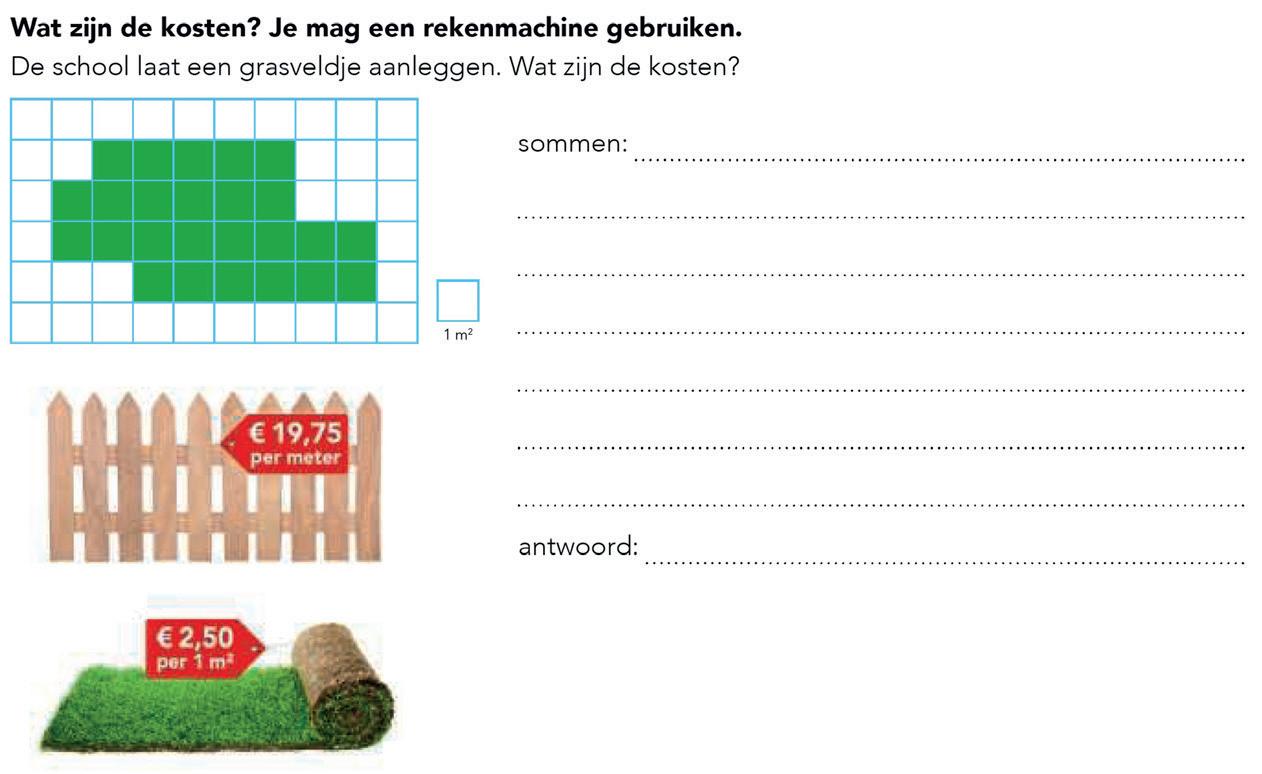 BDe samenhang tussen meten, meetkunde en andere reken-wiskundige domeinen herken je ook in methodes. Naast opgaven over afzonderlijke onderwerpen kom je ook veel opdrachten tegen waarbij verschillende domeinen door elkaar heen spelen. Bij de opgave hieronder bijvoorbeeld gaat het om meten (bepalen van oppervlakte en omtrek) en bewerkingen (rekenen met geld en rekenen met de rekenmachine). Het gaat hier niet alleen om het uitrekenen van het antwoord, maar ook om het zelf bedenken hoe dat antwoord kan worden bepaald (welke ‘sommen’ daarvoor nodig zijn).