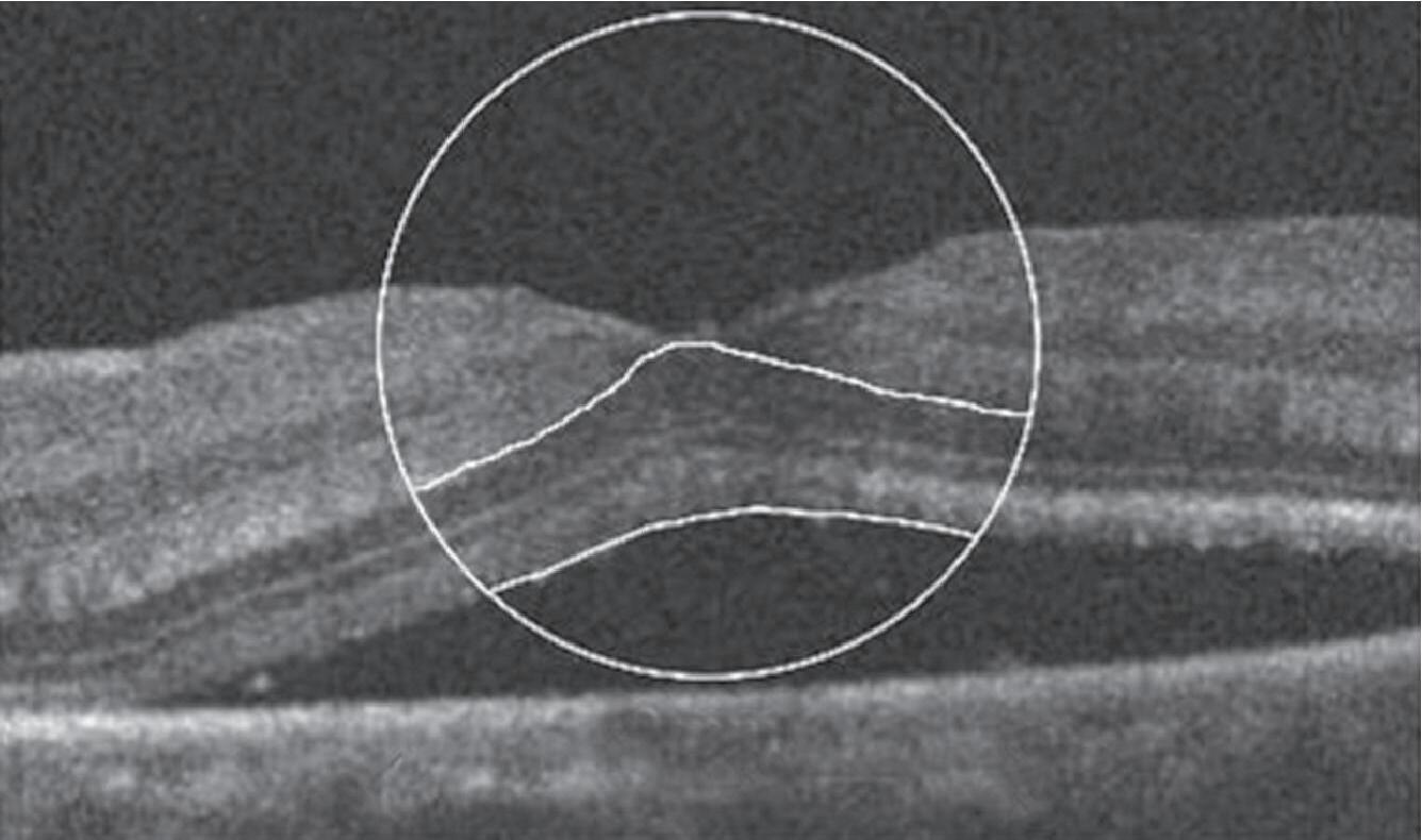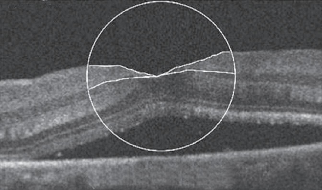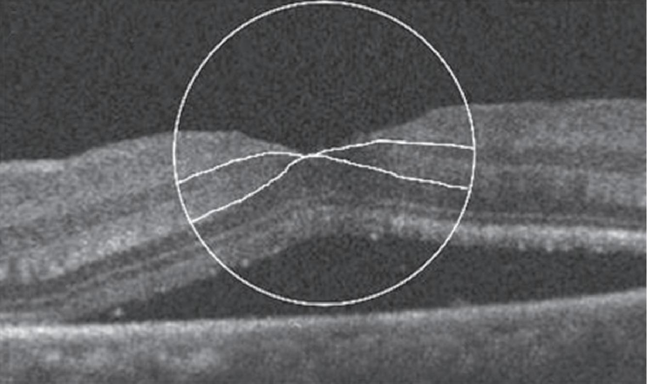 1-27. Imagens pré-operatórias de tomografia de coerência óptica (oCT). Um círculo com um diâmetro de 2 mm foi posicionado manualmente no centro da superfície foveal da mácula destacada na imagem de oCT. a área macular dentro do círculo foi dividida em três seções: camada interna (superior direita: camada de fibras nervosas e camada de células ganglionares), camada intermediária (inferior direita: camada plexiforme interna e camada nuclear interna) e camada externa (inferior esquerda: camada plexiforme externa e camada nuclear externa). (reproduzida com permissão de https://www.hindawi.com/copyright/.)20