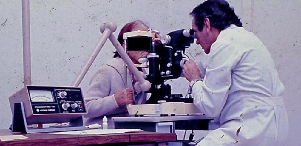 o Professor dr. João alberto Holanda de Freitas realizando um procedimento com um dos primeiros lasers com espelhos, na época em que não existia com fibras ópticas. (Foto do acervo do dr João alberto Holanda de Freitas.)