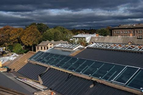 bao gồm một mái dốc thống nhất duy nhất theo hình dạng và kích thước của các tòa nhà ban đầu và