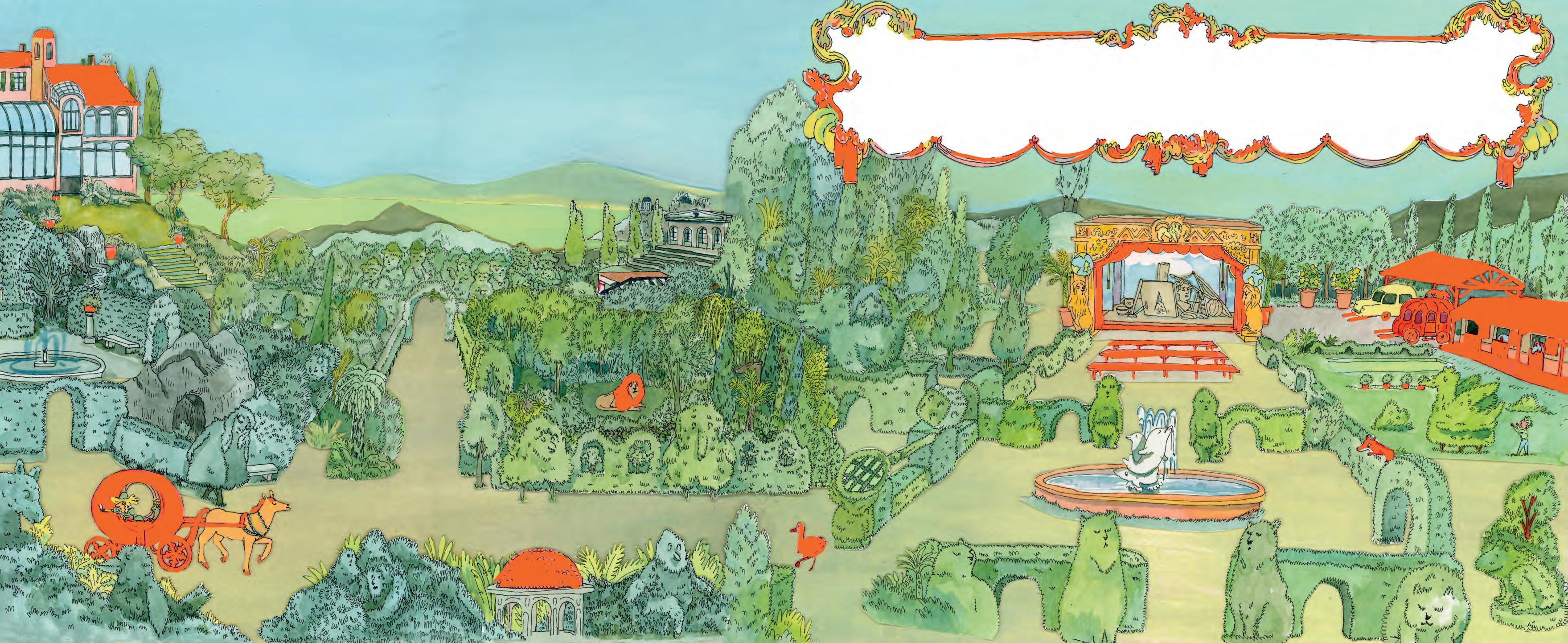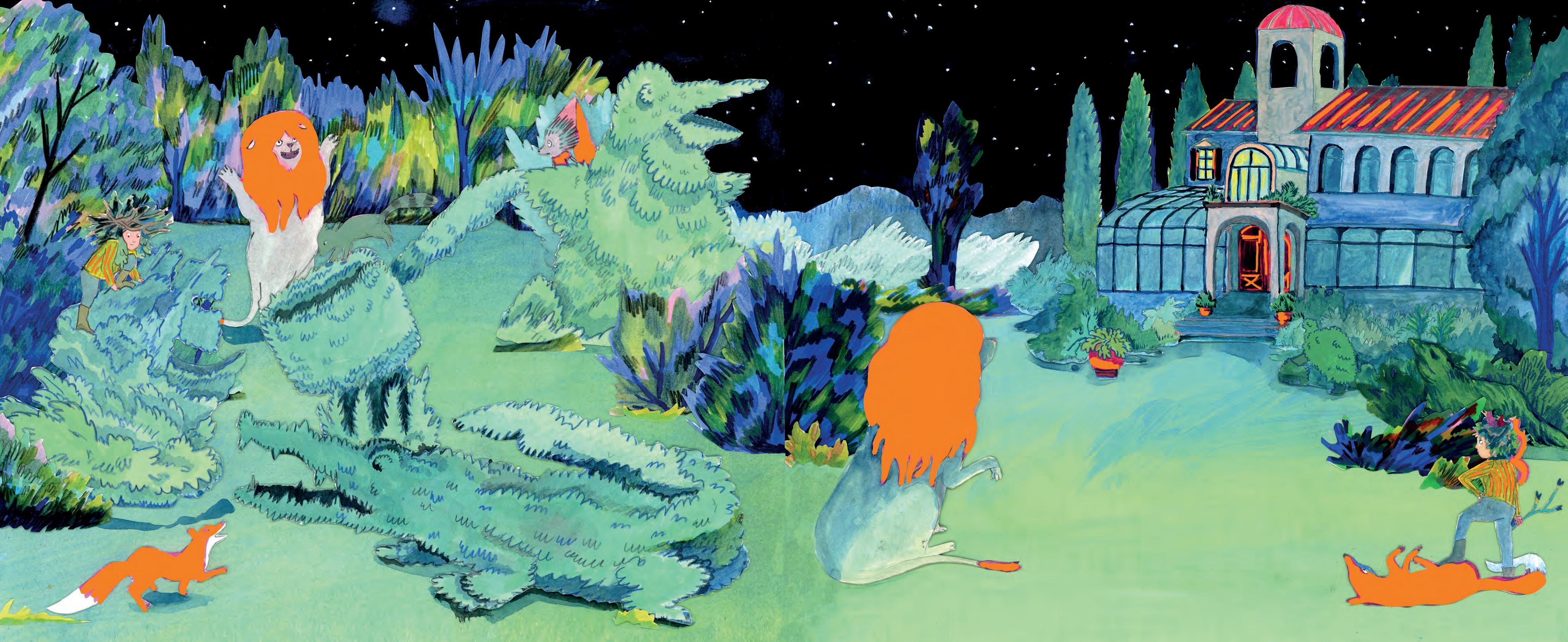 La nuit venue, Pétra et les animaux rejouent ces aventures. Suivant les besoins de l’histoire, les buis changent de forme. On s’amuse parfois jusqu’au petit matin. Il est temps d’aller dormir.
