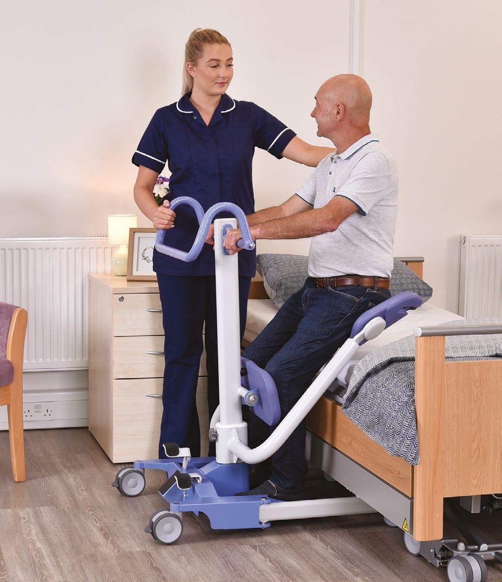 “It has been developed to allow an assisted transfer from one seated position to another. The patient places their feet on to the base plate and pull themselves upwards. The carer provides counterbalance support and turns the Rotastand when the patient is sufficiently lifted.