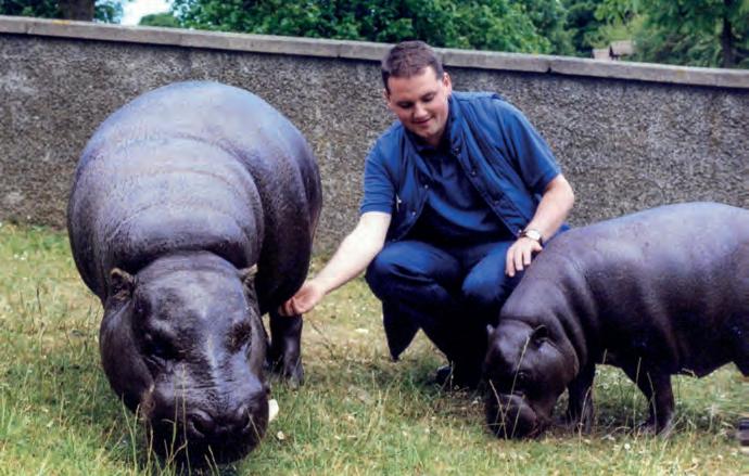 our seventh pregnancy - th\e murm had mastitis and couldn't look after her new female baby, so myself an keeper Karen Stiven hand-reared her. is was only the second pygmy hippo that had been hand-raised in the Euro, ean population, probably the world - it just wasn't done. They're incredibly elifficult to hand-raise.