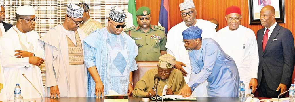 Kwara State Governor, AbdulRahman AbdulRazaq; Chief of Staff to the President, Femi Gbajabiamila; Imo State Governor, Senator Hope Uzodimma; and Minister of Finance and Coordinating Minister of Economy, Wale Edun, during the signing of the 2025 Tax Bills into Law, held at the Presidential Villa, Abuja, yesterday