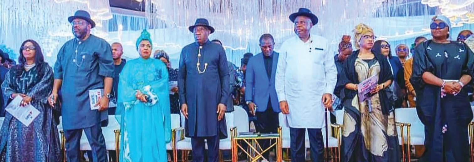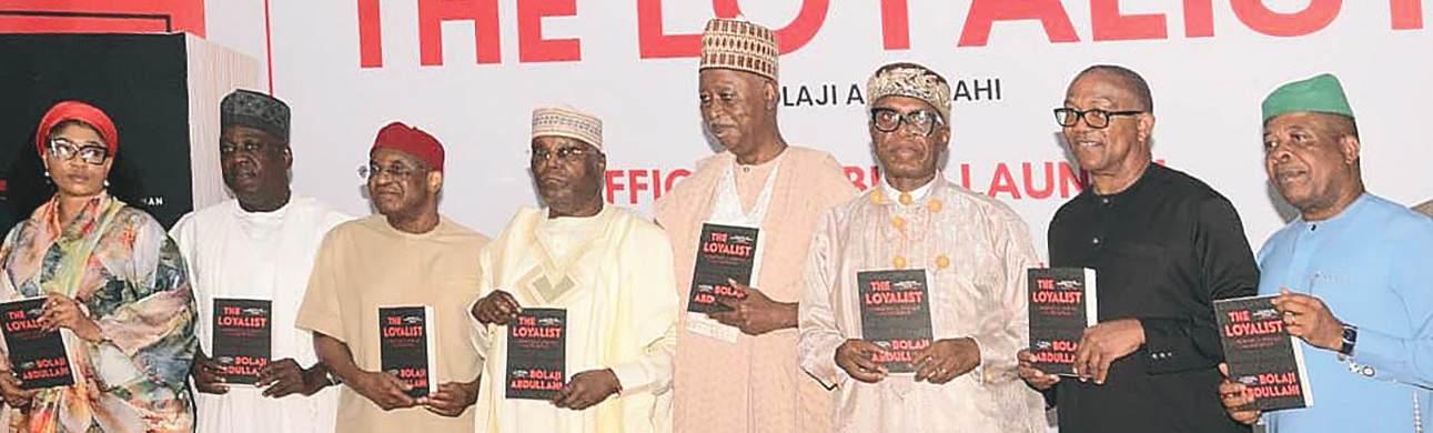 L-R: Wife of the Author, Mrs. Funmilola Bolaji-Abdullahi, Author of the book, ‘The Loyalist’ Mr Bolaji Abdullahi; Former Senate President, and Chairman African Democratic Congress (ADC), Senator David Mark, Former Vice President Alhaji Atiku Abubakar; Chief Host of the occasion, Mallam Kashim Immam; Former Rivers State Governor, Rotimi Amaechi; Former Labour Party Presidential candidate, Mr. Peter Obi and Former Imo State Governor, Emeka Ihedioha, during the official presentation of the book ‘The Loyalist’ in Abuja on Tuesday