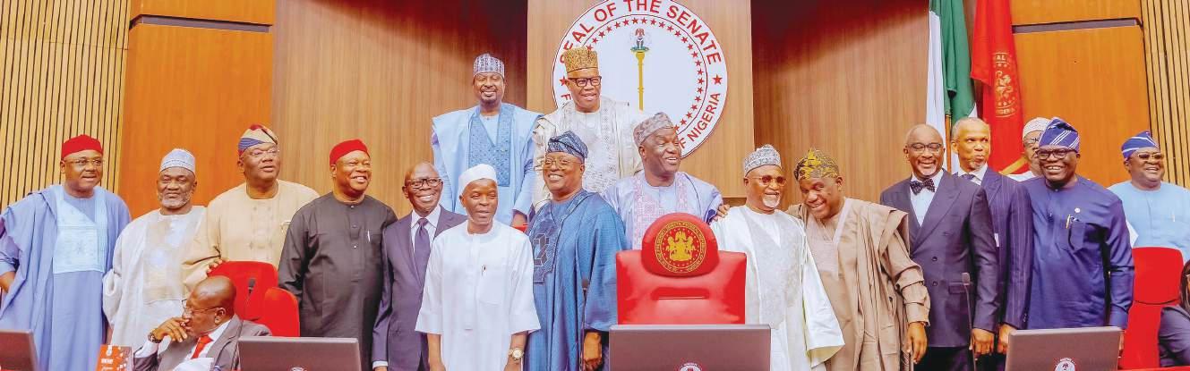 President of the Senate, Godswill Akpabio; his deputy, Jibrin Barau (behind); with other senators, yesterday received Plateau North Senator, Pam Mwadkon Dachungyang into the ruling APC party from the ADP, during plenary