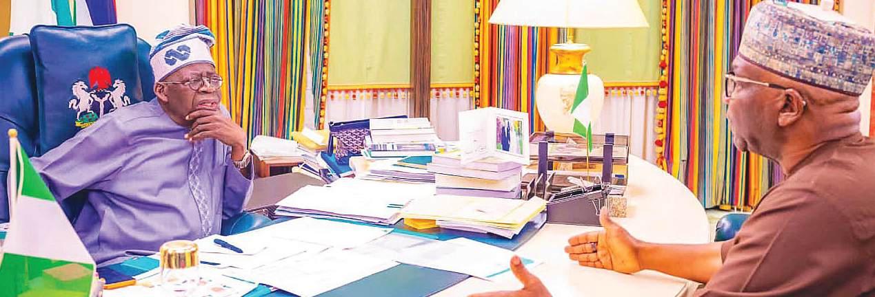 President Bola Tinubu (left) receiving briefings from Kwara State Governor AbdulRahman AbdulRazaq, on the recent terrorist attack in Kaiama, Kwara State, at the Presidential Villa in Abuja ... yesterday
