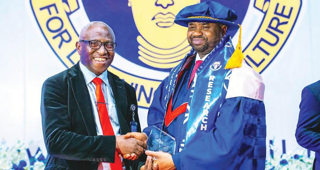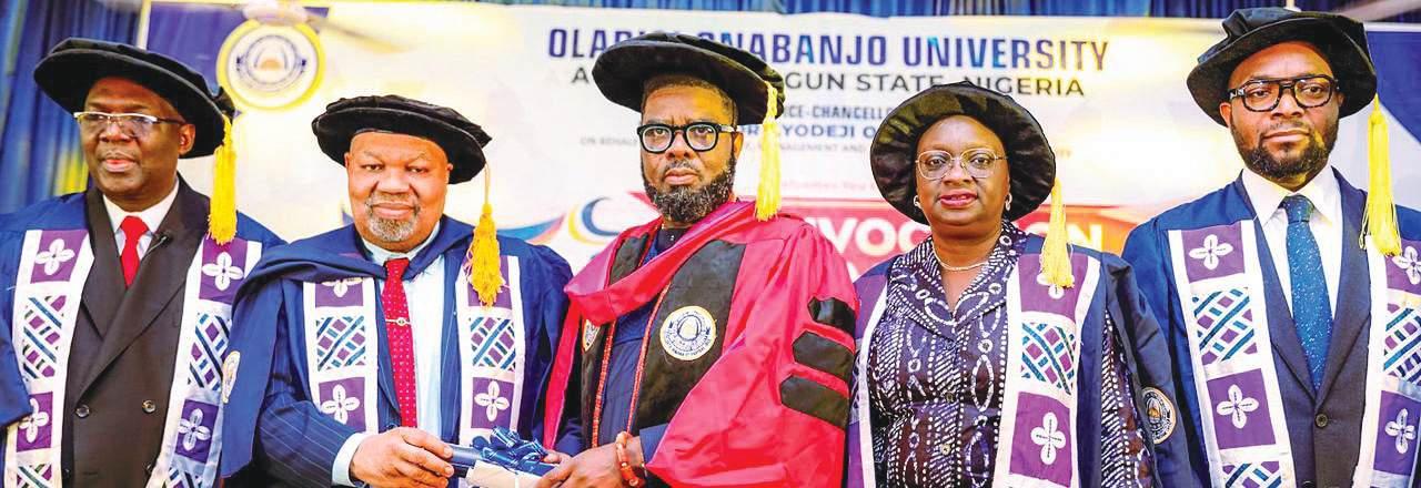 The Vice-Chancellor, Obafemi Awolowo University, Ile-Ife, Osun State (left), Prof. Adebayo Bamire, presenting an Award of Excellence in Fiscal Policy Reform and Administration to the Chairman, Nigeria Revenue Service (NRS), Dr. Zacch Adedeji, at the University, yesterday