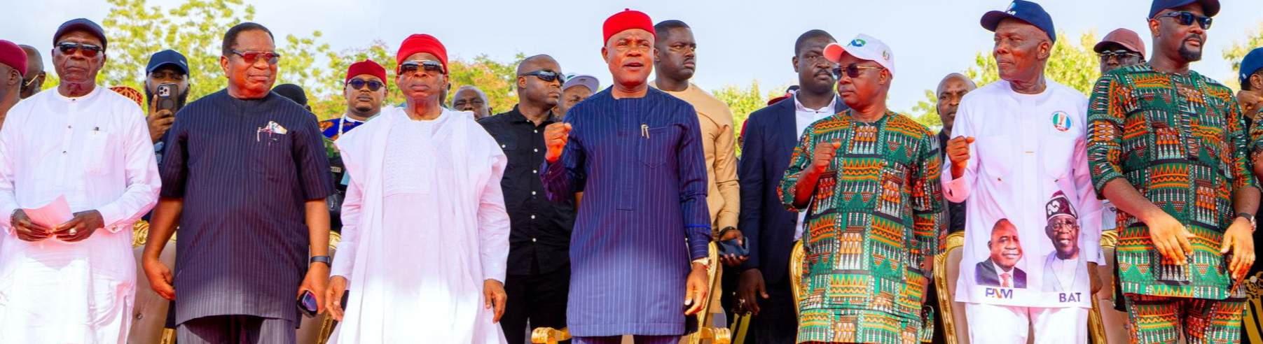 L-R: Former Military Administrator of Gombe State, Group Capt. Joseph Orji (Retd); former Chief of the Naval Staff, Rear Admiral Allison Madueke (Retd); former President of the Senate, Senator Ken Nnamani; Governor of Enugu State, Dr. Peter Mbah; Speaker of the State Assembly, Hon. Uchenna Ugwu; Chairman of the All Progressives Congress, Enugu State, Dr. Martin Chukwunweike, and the Senator representing Enugu West Senatorial District, Senator Osita Ngwu, during a mega second term endorsement rally for President Bola Tinubu and Governor Mbah at Awgu, Enugu State, weekend
