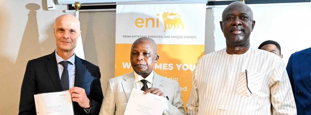 L–R: Chief Executive Officer, Eni, Mr. Claudio Descalzi; Attorney General of the Federation and Minister of Justice, Mr. Lateef Fagbemi; and Minister of State for Petroleum, Senator Heineken Lokpobiri during the signing of an agreement on the resolution of the dispute over OPL 245 in Abuja… recently