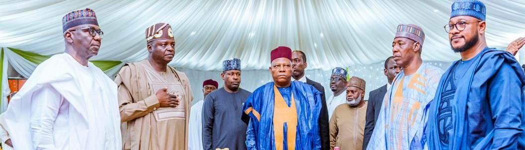 L-R: Kwara State Governor and Chairman, Nigeria Governors’ Forum, AbdulRahman Abdulrazaq; National Chairman, All Progressives Congress, Prof. Nentanwe Yilwatda; Vice President Kashim Shettima; Borno State Governor, Prof. Babagana Umara Zulum; and Zamfara State Governor, Dauda Lawal, during Zulum’s