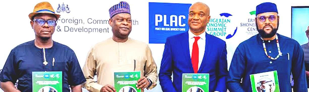 L-R: Executive Director, Ernest Shonekan Centre, Dr. Uche Ogbonna; Chairman, ESC, Mr Kyari Bukar; Board Member, ESC, Mr. Nnanna Ude; and Governance Adviser, Foreign, Commonwealth and Development Office, Dr. Mathew Ayibakuro, at the launch of the Baseline Report on Priority Legislative Actions to Foster a Business-Enabling Environment in Nigeria in Abuja…recently