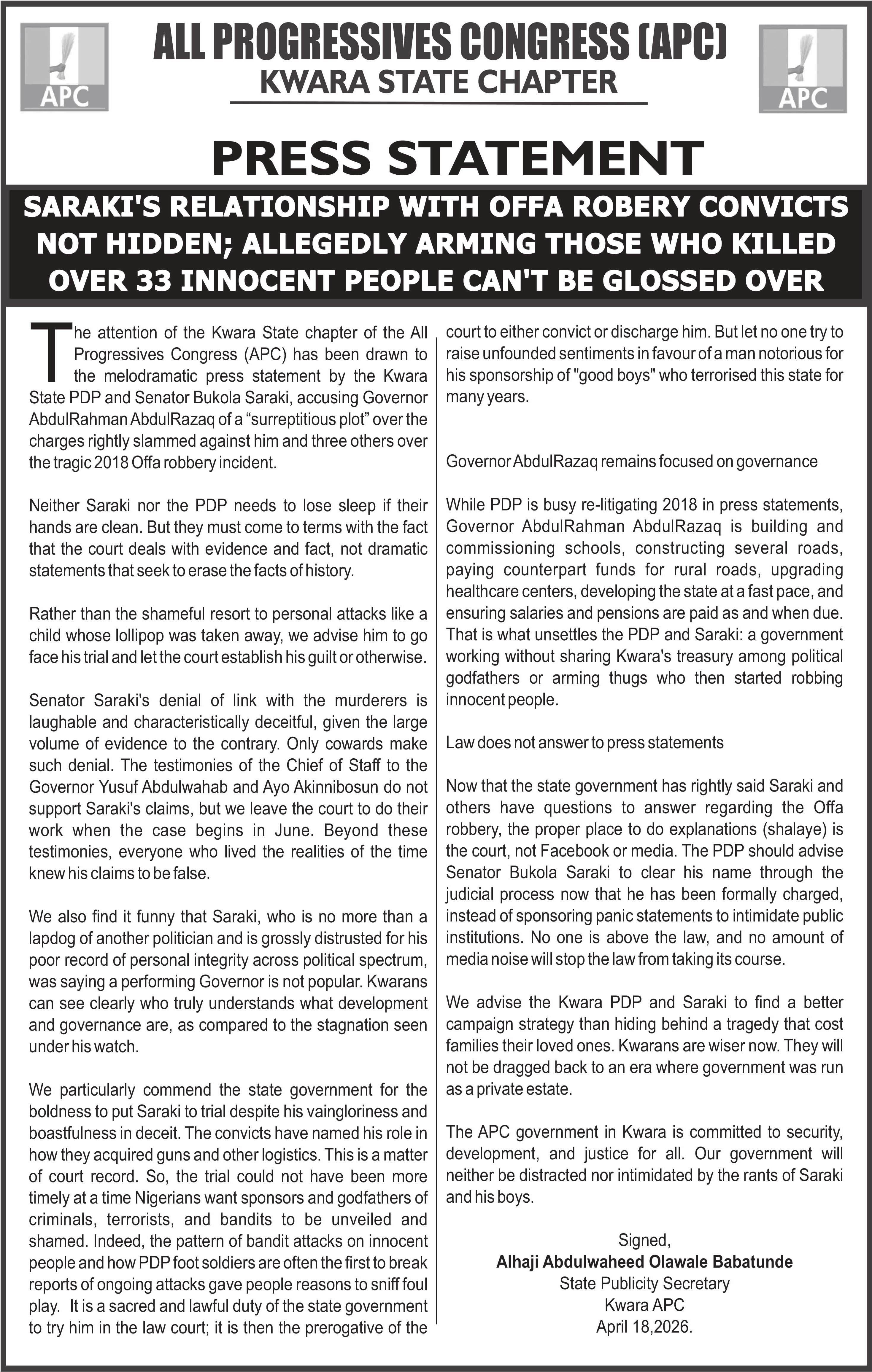 “Senator Saraki’s denial of link with the murderers is laughable and characteristically deceitful, given the large volume of evidence to the contrary. Only cowards make such denial.”