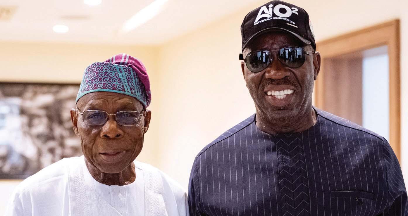 Former President Olusegun Obasanjo (left), and Edo State Governor, Mr. Godwin Obaseki, during the former president’s courtesy visit to Government House, Benin City…yesterday