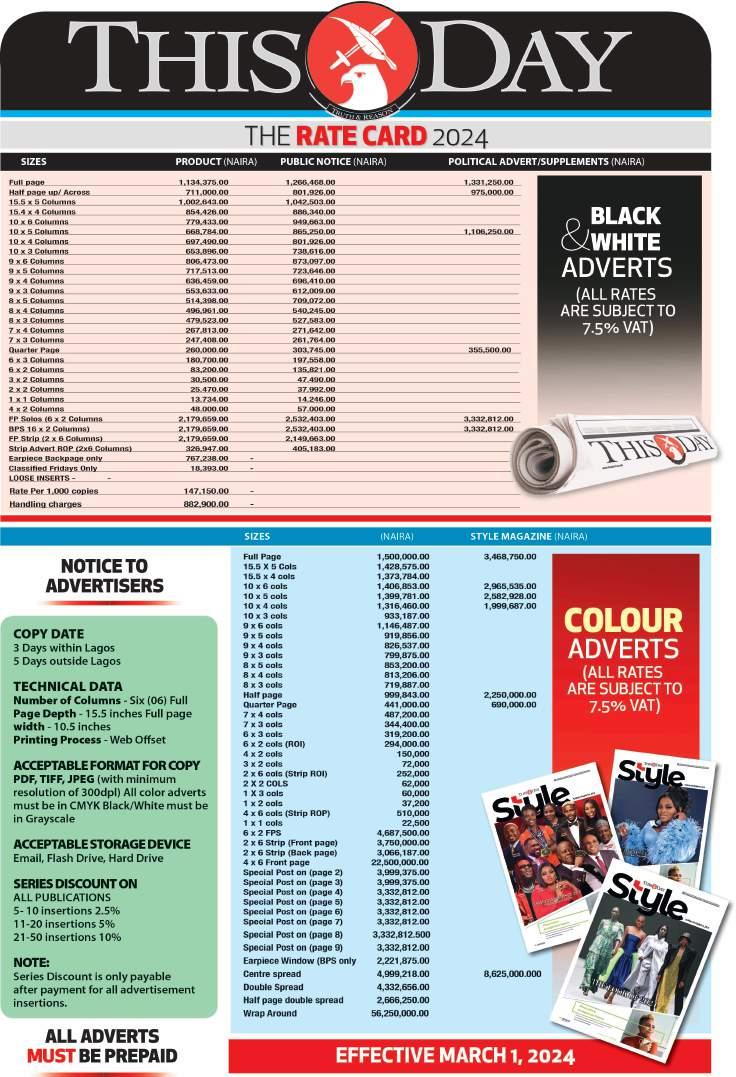 50 Printed and Published in Lagos by THISDAY Newspapers Limited. Lagos: 35 Creek Road, Apapa, Lagos. Abuja: Plot 1, Sector Centre B, Jabi Business District, Solomon Lar Way, Jabi North East, Abuja . All Correspondence to POBox 54749, Ikoyi, Lagos. EmAiL: editor@thisdaylive.com, info@thisdaylive.com. TELEPhoNE Lagos: 0802 2924721-2, 08022924485. Abuja: Tel: 08155555292, 08155555929 24/7 ADVERTiSiNG hoT LiNES: 0811 181 3085 0811 181 3086, 0811 181 3087, 0811 181 3088, 0811 181 3089, 0811 181 3090. ENQUiRiES & BooKiNG: adsbooking@thisdaylive.com