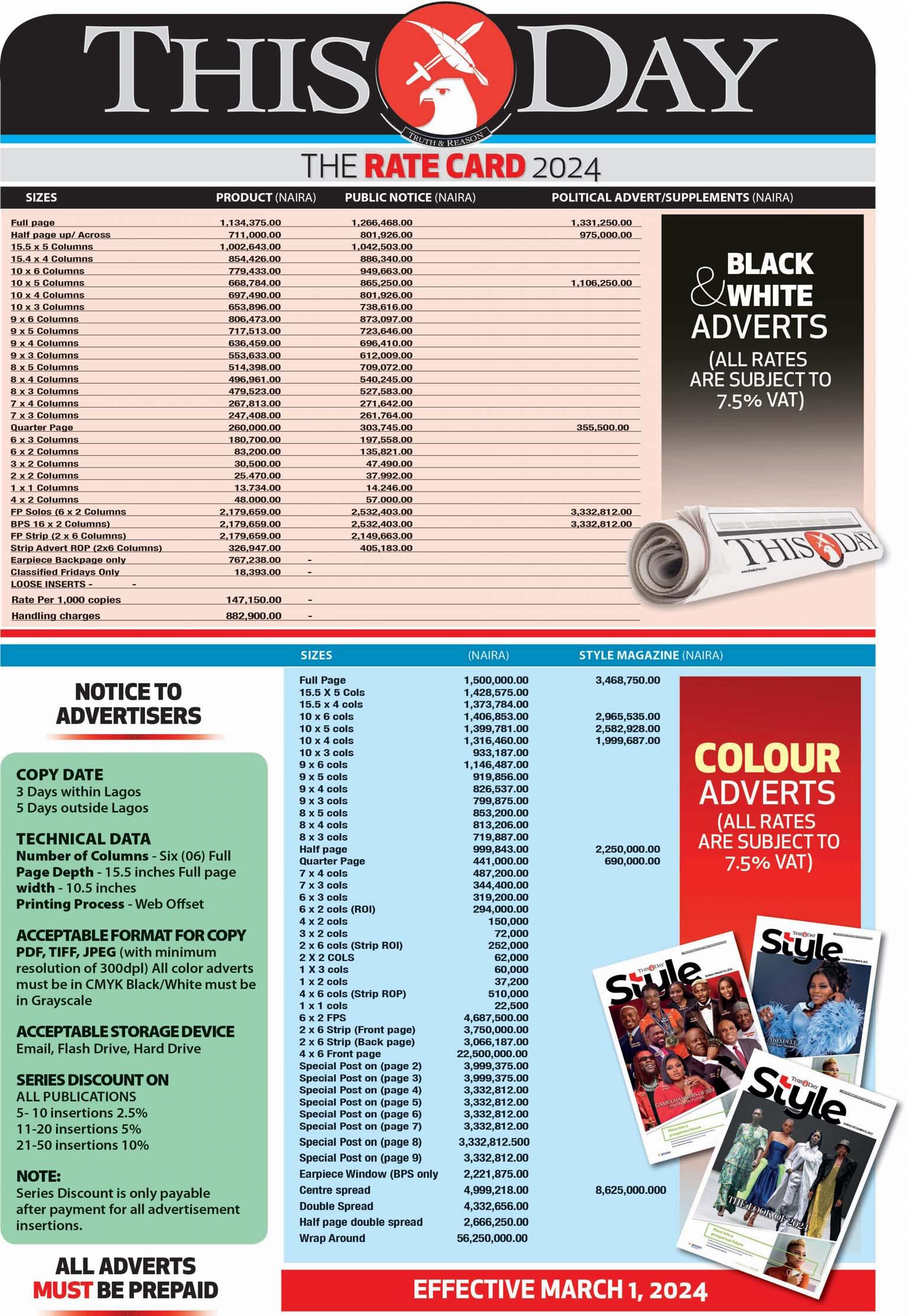 Printed and Published in Lagos by THISDAY Newspapers Limited. Lagos: 35 Creek Road, Apapa, Lagos. Abuja: Plot 1, Sector Centre B, Jabi Business District, Solomon Lar Way, Jabi North East, Abuja . All Correspondence to POBox 54749, Ikoyi, Lagos. EMAIL: editor@thisdaylive.com, info@thisdaylive.com. TELEPHONE Lagos: 0802 2924721-2, 08022924485. Abuja: Tel: 08155555292, 08155555929 24/7 ADVERTISING HOT LINES: 0811 181 3085, 0811 181 3086, 0811 181 3087, 0811 181 3088, 0811 181 3089, 0811 181 3090. ENQUIRIES & BOOKING: adsbooking@thisdaylive.com
