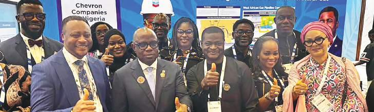 L-R: Chairman, Society of Petroleum Engineers (SPE) Nigeria; Group CEO NNPCL Mr. Bayo Ojulari; Manager Communications, Chevron Nigeria Ltd, Mr Victor Anyaegbudike; EventsCommunications, Corporate Affairs Ms Joy Emeghara and Chief Relations Officer, Nigerian National Petroleum Corporation Ltd, Morenike Adewumi during Ojulari’s visit to Chevron Stand at the ongoing Nigeria International Energy Summit with the theme: “Energy for Peace and Prosperity” in Abuja … yesterday
