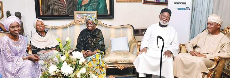 L-R: Daughter of the deceased, Mrs. Toyin Ojora-Saraki; widow of the deceased, Erelu Ojuolape Ojora; wife of former Head of State, Justice Fati Abubakar; and former Head of State, General Abdulsalami Abubakar, during a condolence visit to the Ikoyi home of the Ojoras following the death of Otunba