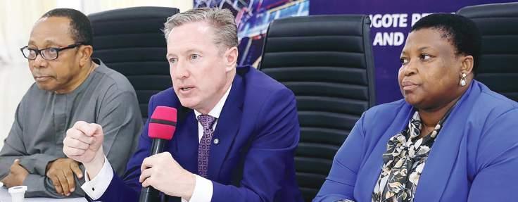 L-R: Group Chief Brand and Communications Officer, Dangote Industries Limited, Mr. Anthony Chiejina; Dangote Petroleum Refinery Managing Director/CEO, Mr. David Bird; and Dangote Petroleum Refinery Head, Economic Scheduling and Planning (EPS), Lindelani Zondi, during the press conference on the state of Dangote Petroleum Refinery held in Lekki, Lagos, yesterdayy