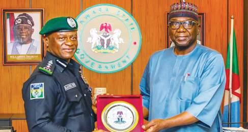 L-R: New Inspector-General of Police Tunji Disu, receiving a souvenir from Governor AbdulRahman AbdulRazaq, during his operational visit to Ahmadu Bello House in Ilorin, Kwara State, on Monday