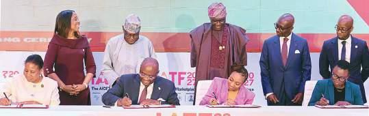Standing: Mrs. Kanayo Awani, Executive Vice President, Intra African Trade and Export Development, Afreximbank; Chief Olusegun Obasanjo, Chair, IATF; Mr. Babajide Sanwo Olu, Governor of Lagos State; Mrs. Lois Ekra, Deputy Chair, IATF; and Mr. Joseph Ifebunandu, Head, Banking Legal Services, Afreximbank, during the Intra African Trade Fair 2027 (IATF2027) host signing ceremony in Lagos, Nigeria, held March 9