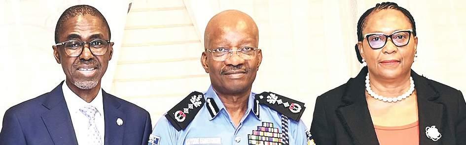 L-R: Managing Director/Chief Executive, Nigeria Deposit Insurance Corporation (NDIC), Mr. Bello Hassan; Inspector General of Police, Kayode Egbetokun; and Executive Director, NDIC (Corporate Services), Mrs. Emily C. Osuji, during a courtesy visit to the Force Headquarters, Abuja… weekend