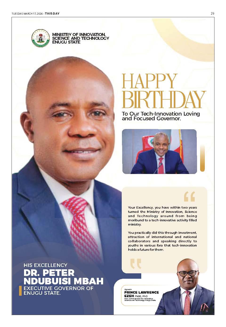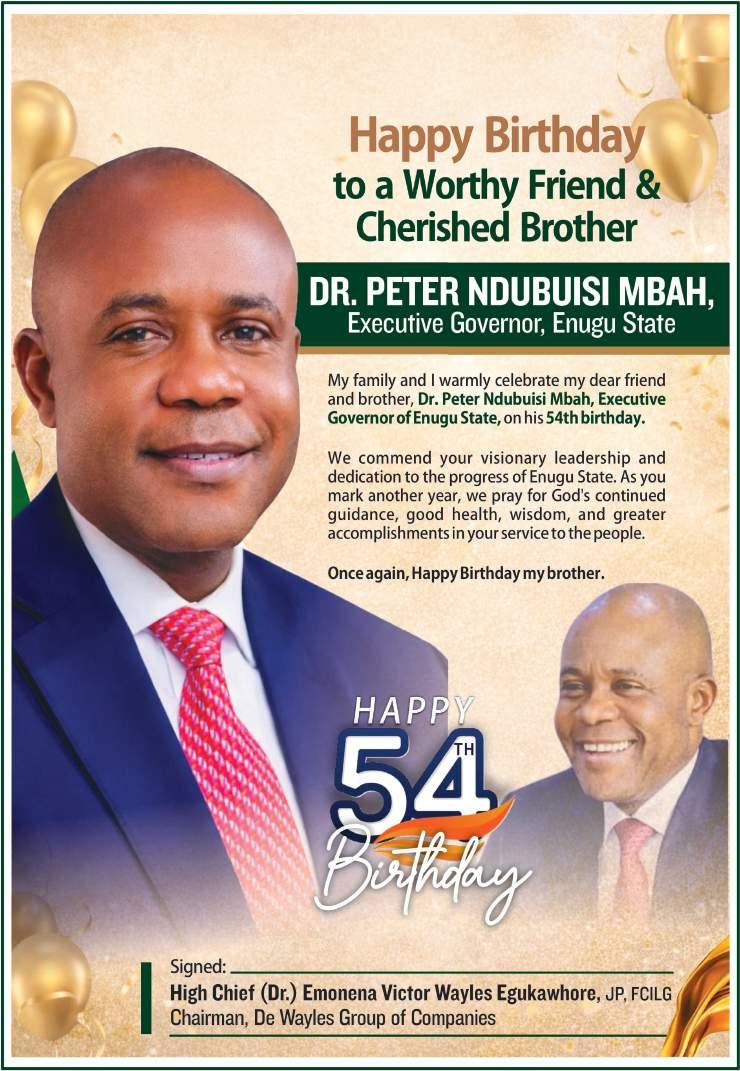 President Bola Tinubu has felicitated Governor Peter Mbah of Enugu State on his 54th birthday on March 17, 2026.