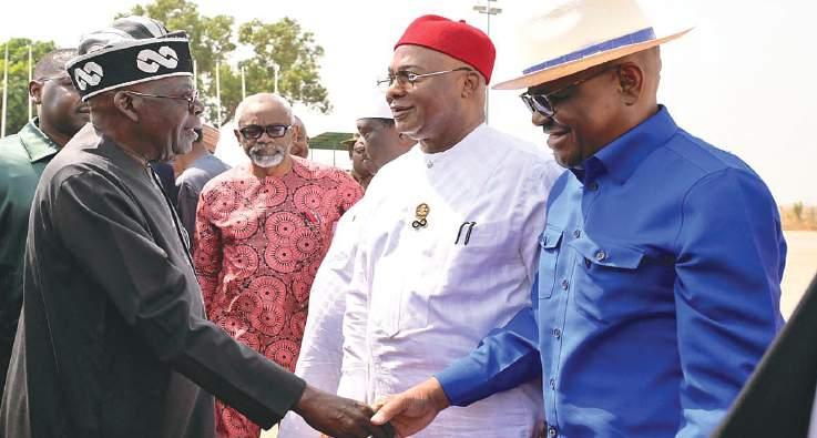 L-R: President Bola Ahmed Tinubu; Chief of Staff to the President, Femi Gbajabiamila; Secretary to the Government of the Federation, (SGF), Senator George Akume; Imo State Governor Hope Uzodimma, and FCT Minister, Nyesom Wike, during the President’s departure from Nnamdi Azikiwe International Airport Abuja for a state