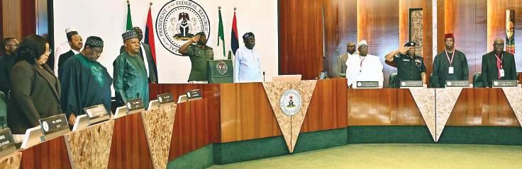 L-R : Head of Service of the Federation, Didi Esther Walson-Jack; Secretary to the Government of the Federation, George Akume; Vice President Kashim Shettima; President Bola Ahmed Tinubu; Chairman Police Service Commission, Hashimun Salihun Argungun; Permanent Secretary, Police Service Commission, Onyemuche Nnamani and Permanent Secretary, Ministry of Foreign Affairs, Dunoma Ahmed during the Police Council meeting held at the presidential Villa Abuja ...yesterday