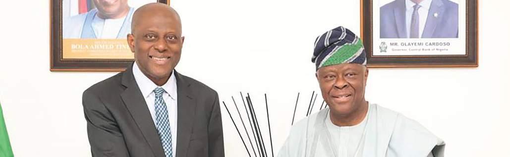 Governor of the Central Bank of Nigeria (CBN), Mr. Olayemi Cardoso (left), and the Minister of Finance and Co-ordinating Minister of the Economy, Mr. Wale Edun, after a strategic meeting at the CBN Head Office, Abuja, on Monday