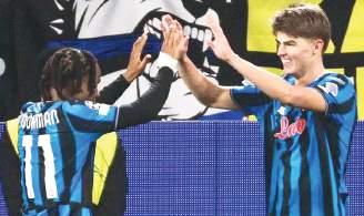 Ademola Lookman (left) and Charles De Ketelaere celebrating Atalanta’s 2-1 comeback win against Chelsea on Tuesday night