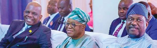 L-R: Executive Secretary/CEO, Nigerian Shippers’ Council, Dr. Pius Akutah; Minister of Marine and Blue Economy, Dr. Adegboyega Oyetola; and Secretary to the Government of the Federation, Senator George Akume, at the launch of Nigerian Shippers’ Council’s Enterprise Content Management System (ECMS) in Abuja, yesterday