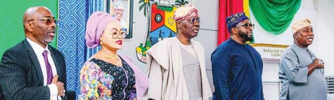 L-R: Lagos State Attorney General and Commissioner for Justice, Mr. Lawal Pedro, SAN; Secretary to the State Government, Barr. ‘Bimbola Salu-Hundeyin; Governor Babajide Sanwo-Olu; Head of Service, Mr. Olabode Agoro; and Commissioner for Tertiary Education, Mr. Tolani Sule, during the inauguration of newly appointed Governing Council of Lagos State University (LASU) at the Lagos House, Ikeja, yesterday