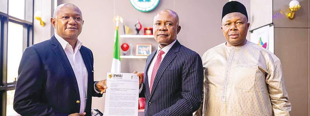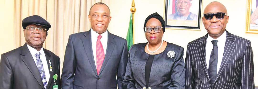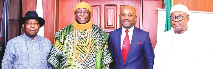 L-R; Permanent Secretary Federal Ministry of Innovation, Science and Technology, Philip Ndiomu; His Royal Majesty, the Asagba of Asaba, Prof. Epiphany Azinge, SAN; Hon. Minister of Innovation, Science and Technology, Dr. Kingsley Tochukwu Udeh, SAN; and member representing Aniocha/Oshimili Federal Constituency, Delta State, Hon. Lawrence Ngozi Okolie, during a royal support visit by the Asagba of Asaba to the office of the Minister in Abuja...recently