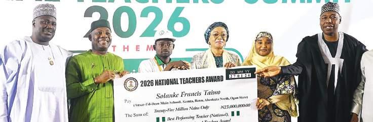 L-R: Minister of state for Agriculture and Food Security, Sen. Dr. Aliyu Sabi Abdullahi; Minister of Education, Dr. Tunji Alausa; Best Performing Teacher (National), 2026 FME National Teachers Award, Solanke Francis Taiwo; First Lady of Nigeria, Senator Oluremi Tinubu; Minister of state for Education, Prof. Suwaiba Said Ahmad; and Borno State Governor, Prof. Babagana Umara Zulum, during the National Teachers Summit 2026, themed Empowering Teachers, Strengthening the System: A National Agenda for Education Transformation and Sustainability, held in Abuja, yesterday