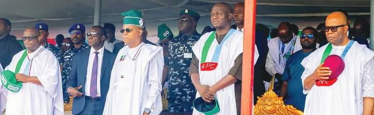 L-R: Governor Caleb Mutfwang of Plateau State, Vice President Kashim Shettima, National Chairman of the All Progressives Congress (APC), Professor Nentawe Yilwatda and President of the Sennate, Godswill Akpabio, at the defection rally in honour of Mutfwang to the APC at the Jos Polo ground yesterday.