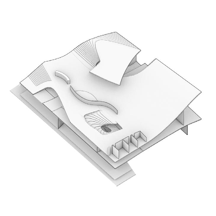 The form of the center is inspired by paper folding. Different angles and layers represent the rolling mountains. The natural landscape is presented in a geometrical architecture form.