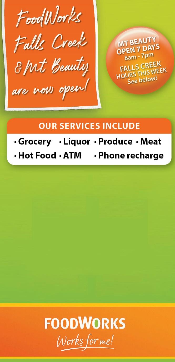 DISTRIBUTION: • All accommodation houses, restaurants, businesses, club lodges & apartments in Falls Creek, Bogong Village, Mount Beauty, Tawonga South, Tawonga & Dederang, plus the RMB’s between Dederang & Tawonga & selected venues in Bright & Myrtleford. ONLINE: • Available in PDF form at: www.fallscreek.com.au/whatson/