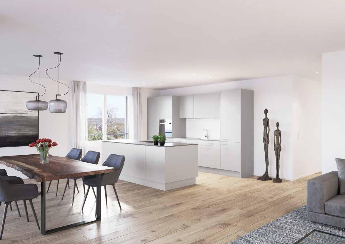 Alle 3.5- und 4.5-Zimmer Wohnungen verfügen über einen hohen Ausbaustandard mit grosszügigem Wohn-Essbereich, moderner Küche, 2 Badezimmern, eigenem Waschturm, einem Balkon oder einer Terrasse und einem Kellerabteil. Geheizt wird mit einer umweltschonenden Erdsonden-Wärmepumpenanlage. Der Innenausbau kann mitbestimmt werden. Dafür steht der Käuferschaft exklusiv eine professionelle Käuferbetreuerin zur Verfügung, die beratend zur Seite steht und auf Wunsch auch bei Bemusterungsterminen vor Ort unterstützt. Tiefgaragen- und gedeckte Aussenparkplätze können dazu erworben werden.